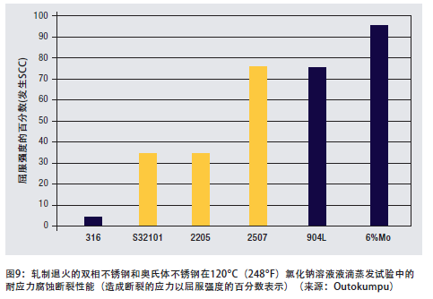 圖9給出了若干軋制退火的雙相不銹鋼和奧氏體不銹鋼在苛刻的氯化物介質中的相對耐氯化物應力腐蝕斷裂性能。得出這些數據的液滴蒸發試驗腐蝕條件很苛刻,因為試驗溫度為120℃(248℉)的高溫,并且氯化物溶液由于蒸發而濃縮。試驗中兩種雙相不銹鋼2205和2507最終在所受應力達到其屈服強度的某一百分比時發生斷裂,但這一百分數比316不銹鋼相應的百分比值高得多。由于雙相鋼在常壓下的氯化物水溶液中能夠耐應力腐蝕斷裂,例如耐保溫層下的腐蝕,所以在已知304和316不銹鋼會發生斷裂的氯化物介質中,可以考慮使用雙相不銹鋼。