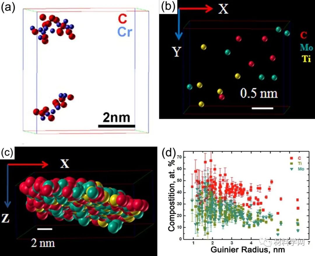圖2.(a)在熱軋低碳鋼的鐵素體中形成的C-Cr團簇的選定原子圖。(b)C-Mo-Ti團簇和(c)(Ti,Mo)C析出在C-Mo-Ti鋼的鐵素體中。(d)團簇和納米顆粒的溶質濃度與在C-Mo-Ti鋼中形成的Gunier放射性的函數關系。圖5.相間析出的各種形成機制示意圖:(a)產生平面薄片的壁架機制和(b)產生彎曲薄片的準壁架機制;(c)導致纖維相間析出的超邊緣機制(I將碳化物固定在一個單元架上,II-碳化物的生長超過鐵素體的生長,以及III-壁架不會從碳化物上脫開,從而導致纖維狀碳化物的形成);(d)擴展的壁架機制圖6.(a,c)在NPLE(b)和PE(d)條件下,鐵素體/馬氏體(本來是奧氏體)界面上的碳原子圖和(b,d)組成圖圖7.轉變溫度對(a)層間間距和(b)沉淀物數量密度的影響圖9.(a)碳原子圖,顯示了熱軋低碳鋼的鐵素體中的Cottrell氣氛;(b)C,Mo和Nb原子圖顯示了TMP后Nb-Al-Mo鋼的多邊形鐵素體中的細小顆粒,(c)整個細小析出物的代表性濃度曲線。圖11. TEM顯微照片,顯示了貝氏體的形態:(a)顆粒貝氏體[220];(b)針狀鐵素體[220];(c)上貝氏體[221];(d)下貝氏體[220]。PF是多邊形鐵素體,BF是貝氏體鐵素體,M是馬氏體,RA是殘余奧氏體。圖12.位錯系統的3D結構,其在0.63%的應變下具有強的析出物,顯示出錯綜復雜的位錯網絡,嵌入了Orowan環圖13 (a)納米貝氏體的明場TEM圖像,(b)碳原子圖和相應的7.5 at。高爐中簇和碳化物的%C等濃度表面,(c)Fe-C簇和顆粒的溶質濃度隨Guinier半徑的變化,(d)跨Fe-C碳化物的組成分布圖14 Fe-20.1Ni-1.8Mn-1.6Ti-0.59Al(wt。%)合金在823 K時效時的析出演變:(a)3.88 at。%Ti,2.92 at。Mn含量為3.38 at。600 s后出現棒狀和板狀(Fe,Ni)3(Ti,Al,Mn)和球形NiMnAl沉淀的%Al等濃度表面,(b)沿圖中所示方框橫跨板狀顆粒的濃度分布(一種); (c)原子圖顯示Mn和Al在(Fe,Ni)3 Ti析出物中的偏析以及新的(Fe,Ni)3(Mn,Al)析出物的成核