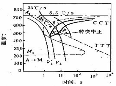 CCT曲線位于TTT曲線右下方。CCT曲線獲得困難,TTT曲線容易測得。可用TTT曲線定性說明連續冷卻時的組織轉變情況。方法是將連續冷卻曲線繪在C曲線上,依其與C曲線交點的位置來說明最終轉變產物。