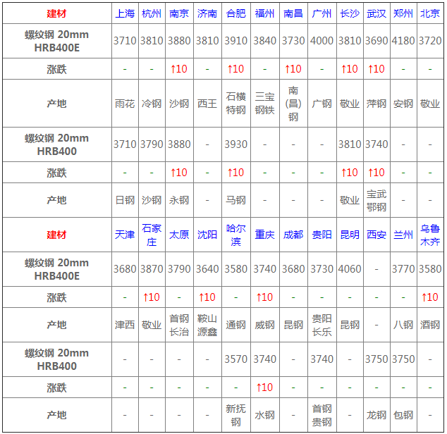 螺紋鋼24個市場中9個市場上漲10,20mmHRB400E平均價格3792元/噸,較上個交易日上調4元/噸。